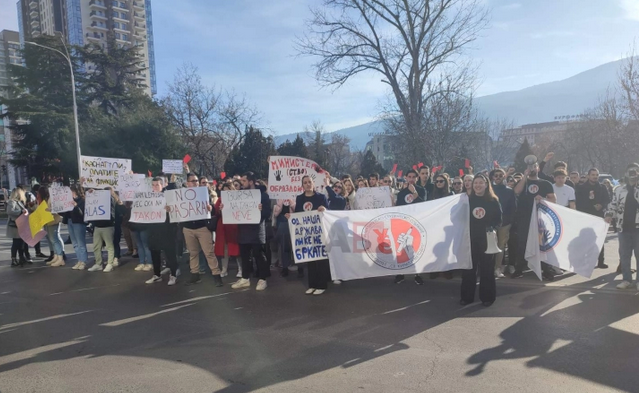 „Сакаме промени, сакаме одговорност“ извикуваат студентите кои револтот го изразуваат со свирежи, транспаренти и „црвени картони“, собрани на булеварот пред МОН, кој е затворен за сообраќај.