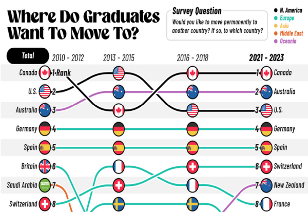 Според податоците од анкетата на „Галуп“ и рангирањето на индексот „Футлус“ на „Економист“, оваа анализа ги прикажува најпосакуваните дестинации за дипломците од 2010 до 2023 година.