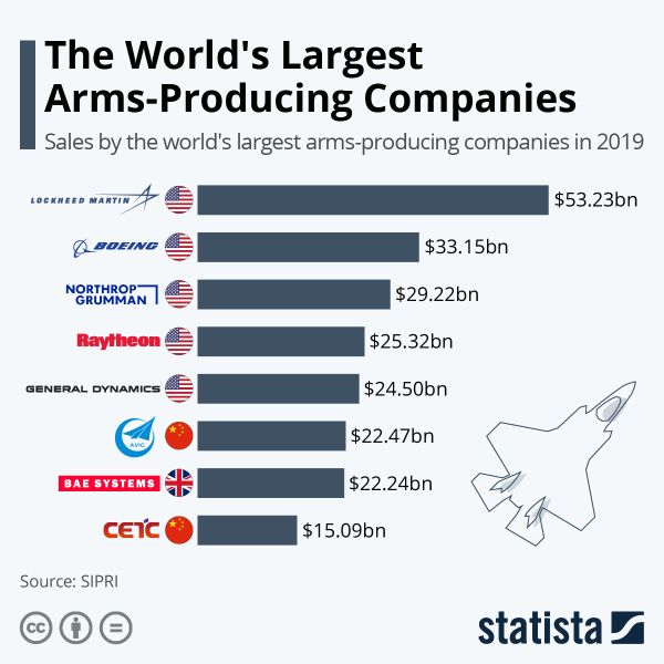 Податоците за индустријата за оружје на SIPRI покажуваат дека продажбата на оружје од страна на најголемите светски компании за производство на оружје и воени услуги изнесувала 361 милијарда долари во 2019 година.