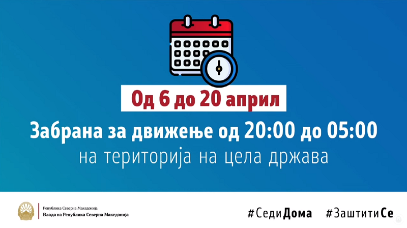 Владата одлучила од утре, 6 април, да се воведе забрана и посебен режим на движење за граѓаните, т.е. полициски час од 20 часот до 5 часот наутро.