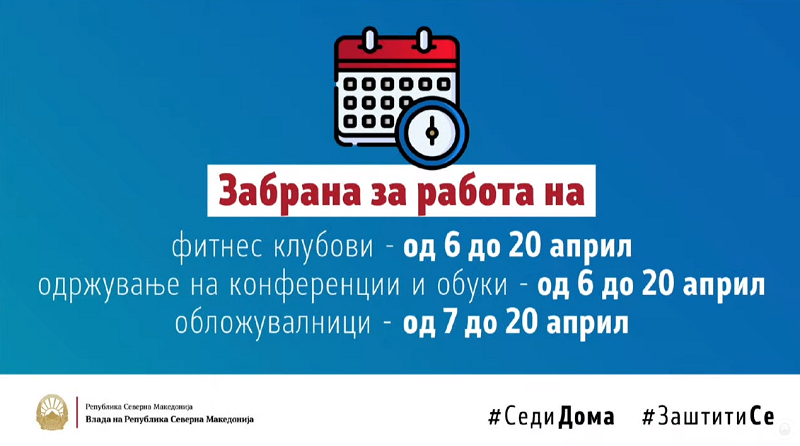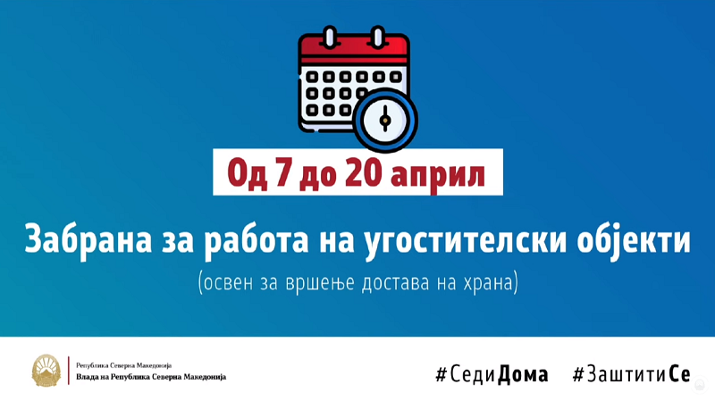 Од 7 април ќе има забрана за посетители и гости во сите угостителски објекти или онаму каде што се врши продажба и подготовка на храна. Може да се врши достава на храна или да се издава храна преку штанд. Оваа мерка е во сила до 20 април. Исклучок од неа се аеродромите, како и хотели, мотели, хостели, пансиони за лица сместени во нив.