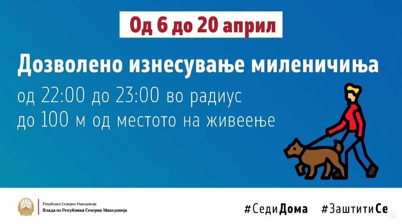 За време на забраната, лицата што живеат во колективни објекти и имаат домашни миленичиња може да ги шетаат од 22 до 23 часот на растојание до 100 метри од објектот на живеење.