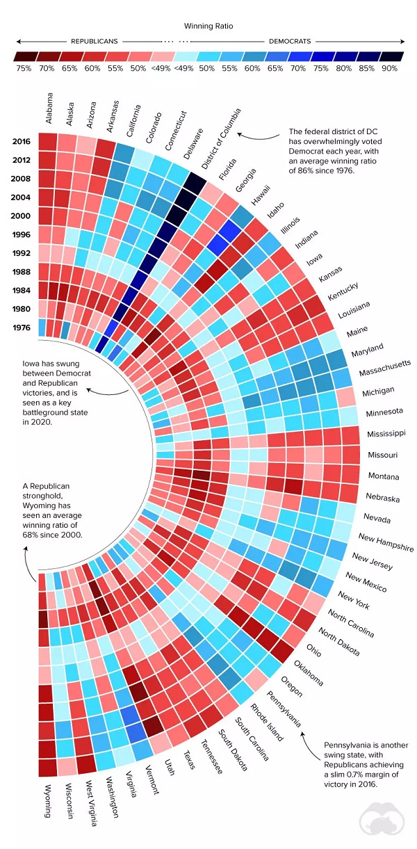 Како што покажуваат податоците, некои држави како Алјаска, Оклахома и Вајоминг постојано се поддржувачи на Републиканската партија. Од друга страна, Хаваи, Минесота и округот Колумбија се поддржувачи на Демократската партија со децении.
