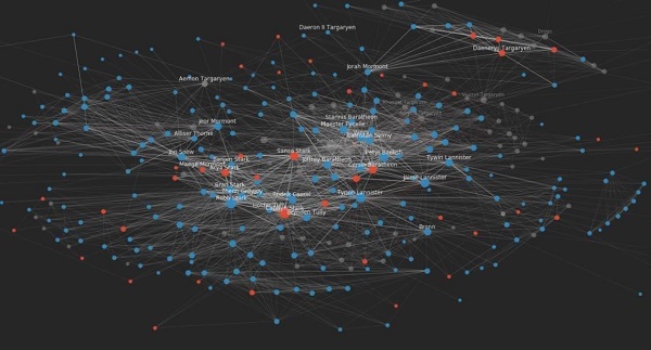 Графиконот во продолжение ја покажува поврзаноста помеѓу ликовите. Сините точки се машки ликови, црвените се женски, а сивите точки се ликови што умираат.