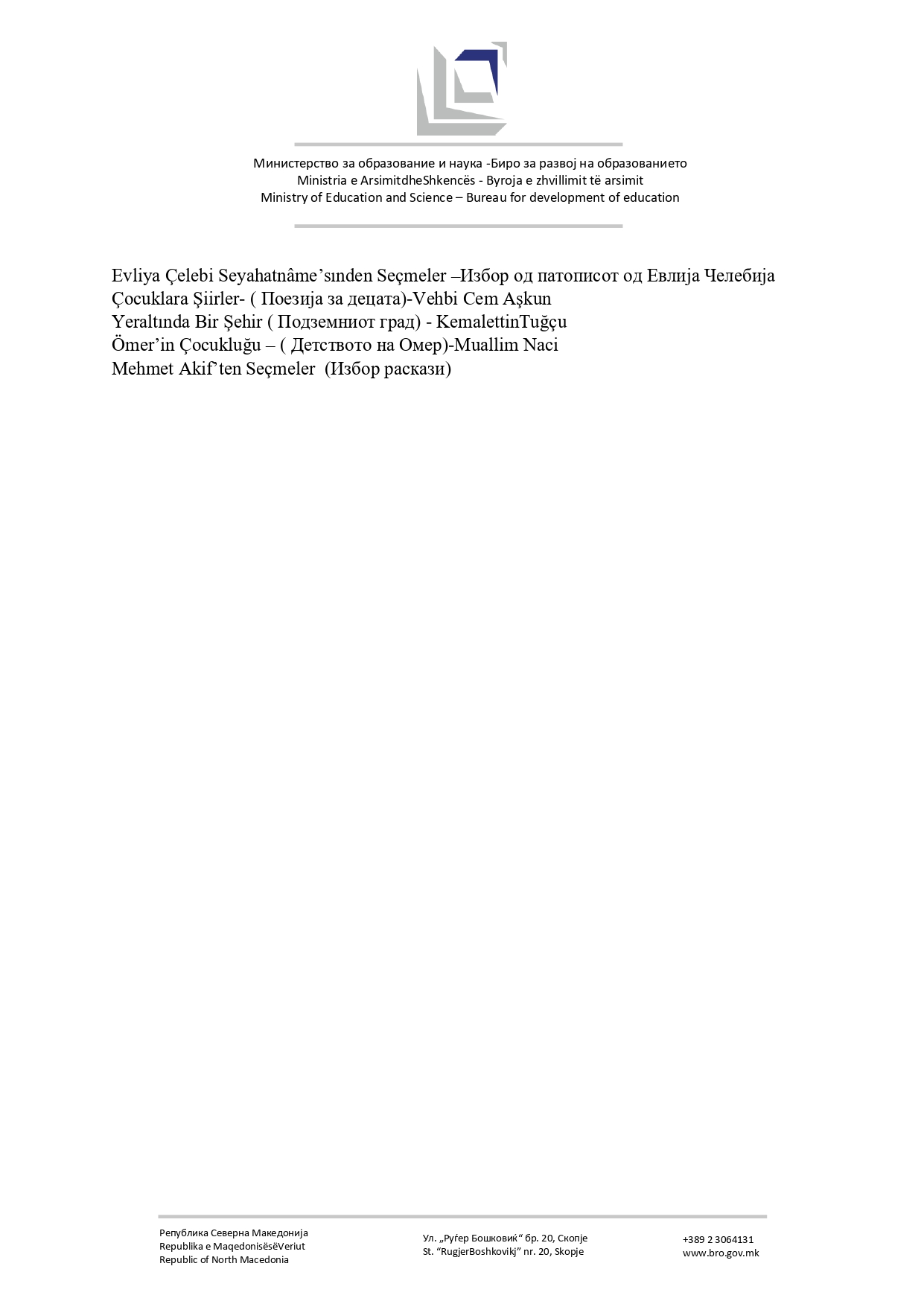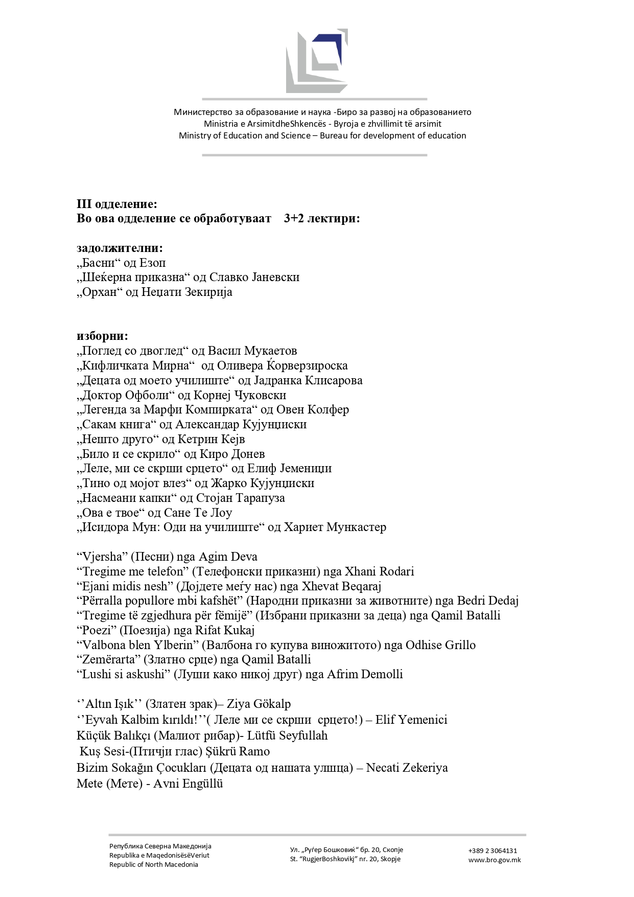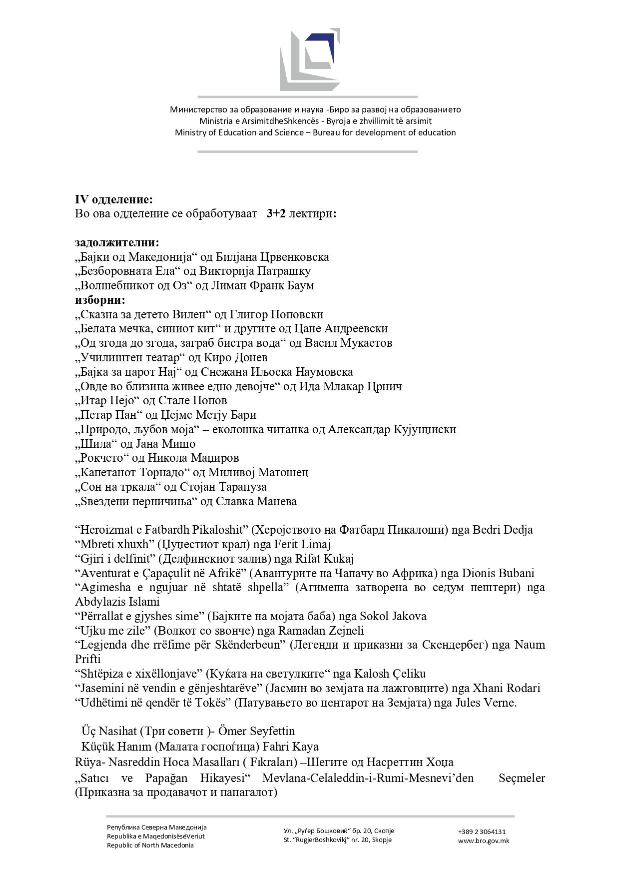 Списокот со лектири за основно образование ќе се менува. Министерството за образование и наука и Бирото за развој на образованието организираат јавна дискусија за нов предлог-лектирен список за основното образование и упатуваат покана до сите заинтересирани страни - наставници, стручни служби и други чинители во образованието - активно да се вклучат во дефинирање на современ, инклузивен и квалитетен лектирен список, кој ќе одговара на реалните потреби на учениците и наставниот процес.