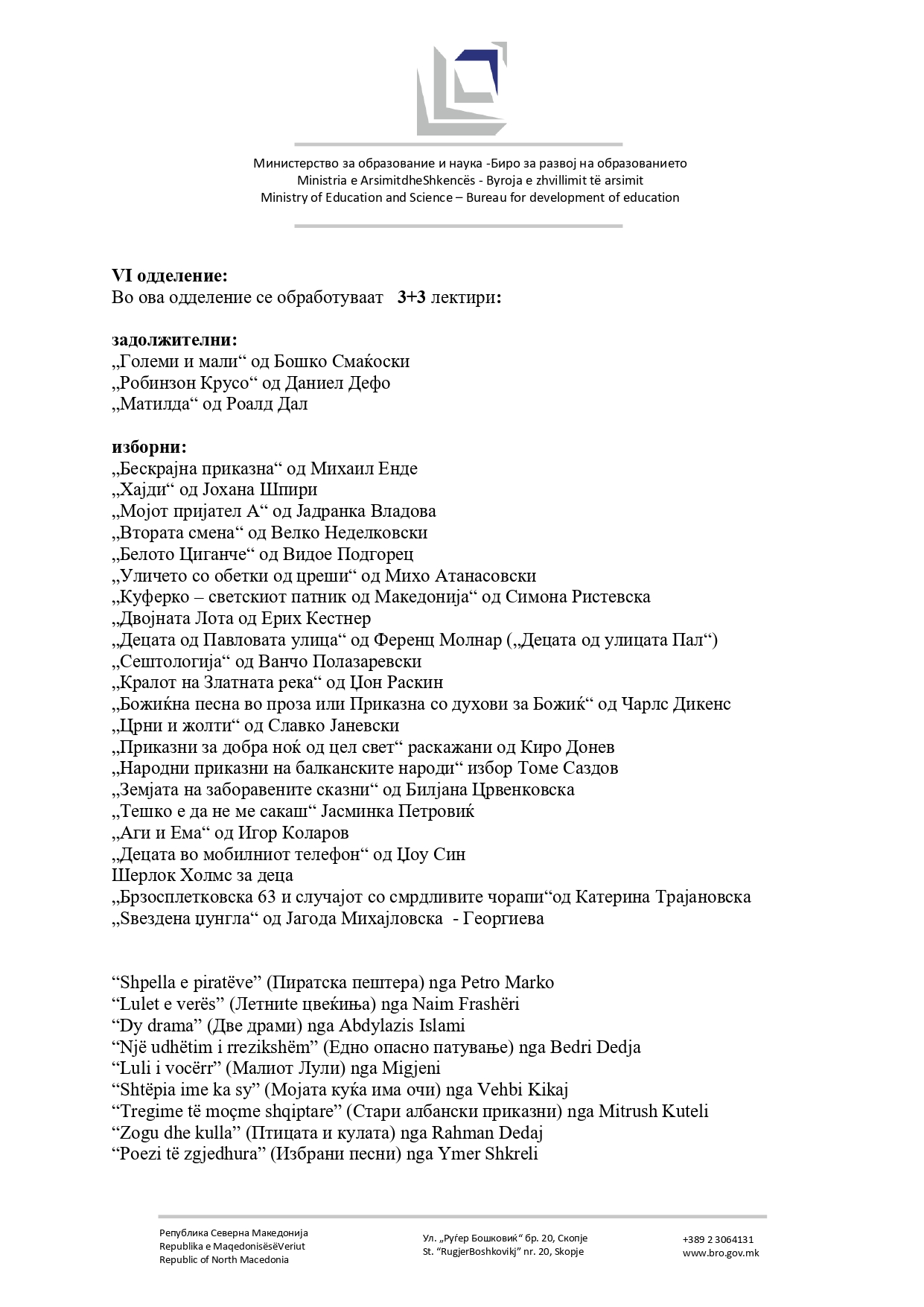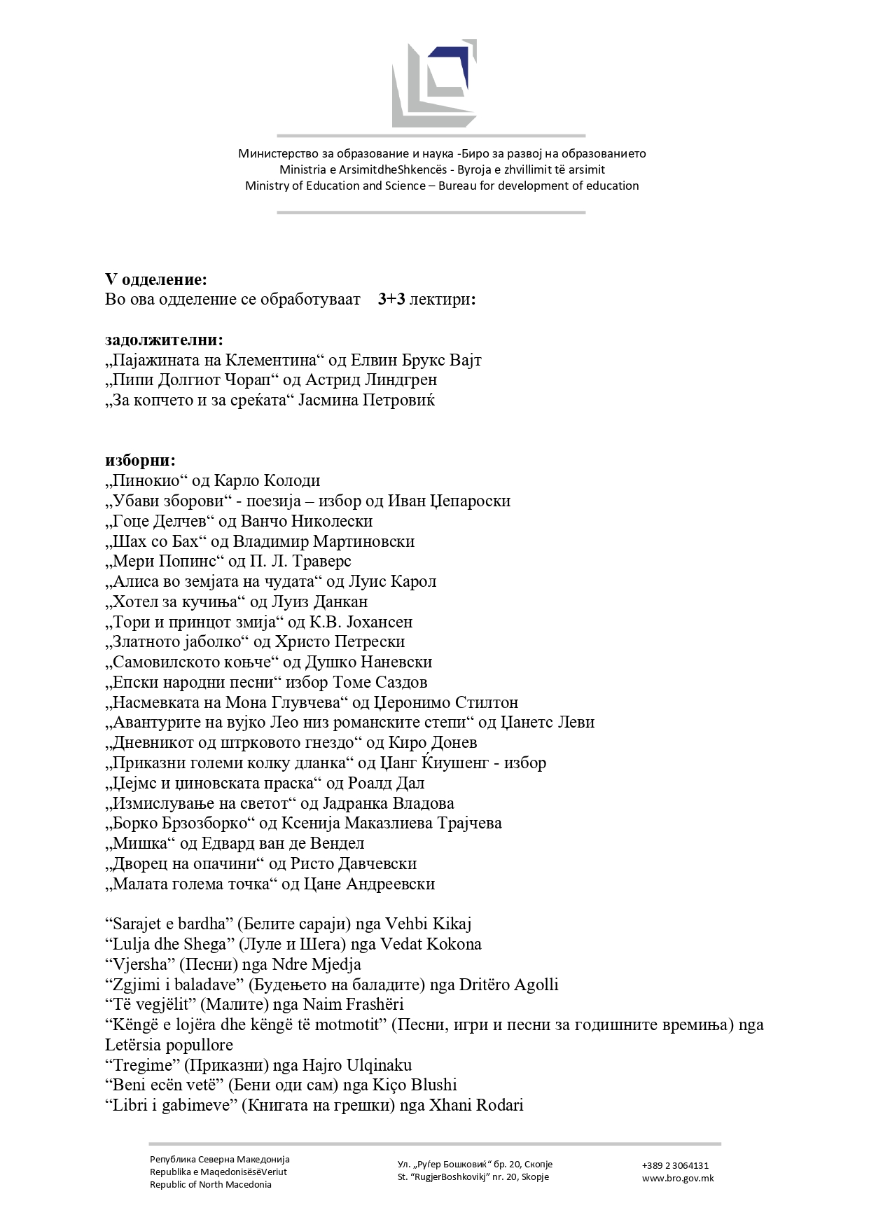-Потребата од ажурирање на лектирниот список произлегува од стремежот за постојано усогласување на наставните содржини со современите образовни цели, развојните карактеристики на учениците и нивниот социјален и емоционален контекст. Предлог-списокот е изработен врз основа на списокот што се реализира во наставата од учебната 2019/2020 година. Одредени наслови се отстранети поради ниска читаност, несоодветност на возраст или содржина. Поради промени во наставните програми и интердисциплинарно поврзување во наставата, некои дела се преместени во друго одделение или добиле нов статус – од задолжителни станале изборни и обратно. Во предлогот се вклучени дела што обработуваат современи и значајни теми, меѓу кои: идентитет и самодоверба, пријателства и меѓучовечки односи, училиштен живот и булинг, емоционални и психолошки предизвици, културна разноликост, инклузија на деца со посебни образовни потреби. Целта е учениците да читаат содржини блиски на нивната реалност, но и доволно слоевити за анализа и симболичко толкување, што ќе поттикнува критичко размислување, дискусија и личен развој - стои во соопштението на МОН.