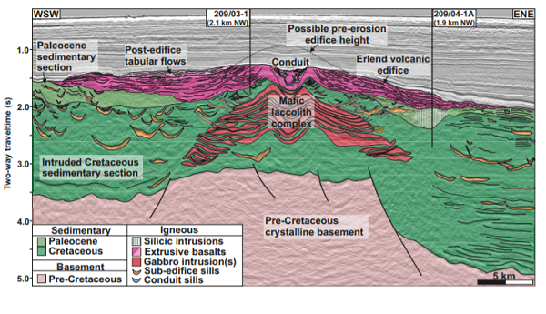 Вулканот Ерленд последен пат еруптирал пред 55 милиони години и денес се наоѓа под талог дебел повеќе од еден километар. Фај Вокер од Универзитетот во Абердин и негови колеги користеле сеизмички фотографии и податоци од локации за копање нафта за да ја илустрираат