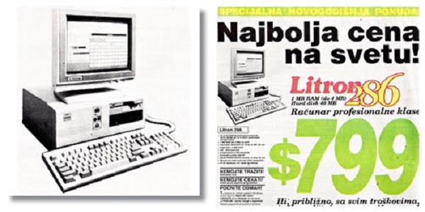 Најдобрата цена на светот: 799 долари - или приближно, со сите трошоци, едногодишна гаранција и одличен сервис: 15.400 динари! „Литрон 286“ - 1MB RAM (до 4MB) Hard disk 40 MB, компјутер од професионална класа.