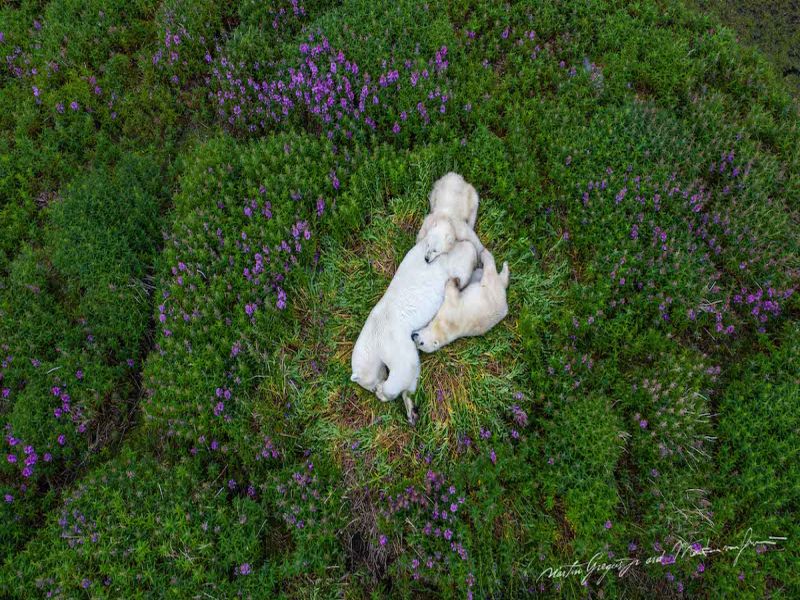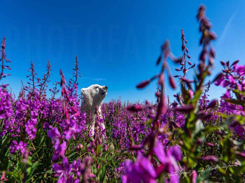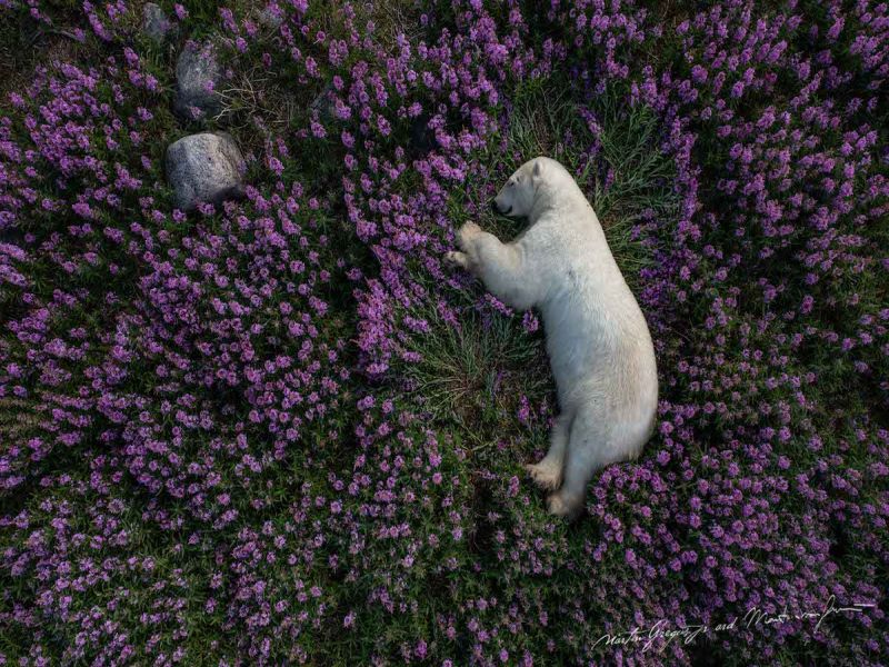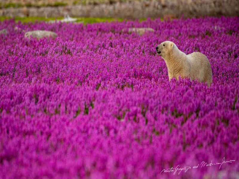 Особено впечатливи се неговите фотографии од поларните мечки во полиња со виолетови цветови, кои се чини дека уживаат во моментот.