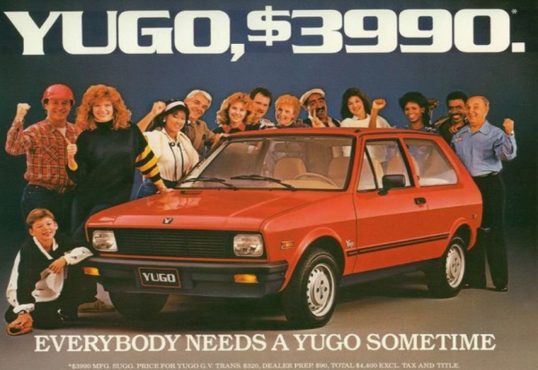 Кога ќе се спомене за „непоправлив“ автомобил на кој било начин, многумина веднаш помислуваат на „едсел“, „азтек“, „пејсер“, „родиус“ и други. Еден стои над сите (или можеби под сите), а тоа е „југото“. Во средината на 80-тите години „Фиат“ само што се повлече од американскиот пазар, оставајќи празно место за некоја евтина марка на автомобили. Освен тоа, „југото“ користеше многу делови од италијанскиот производител.
