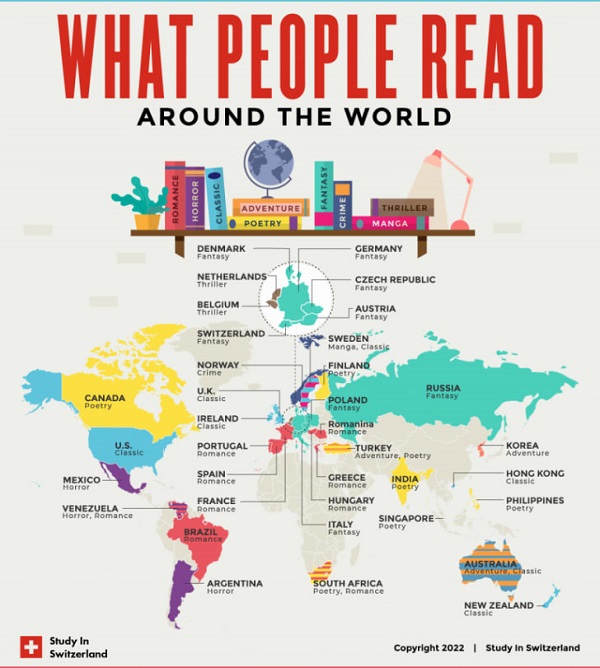 Мапа направена од веб-страницата „Студирање во Швајцарија“ покажува кои се најпопуларните литературни жанрови според региони и земји, според пребарувањата на „Гугл“.