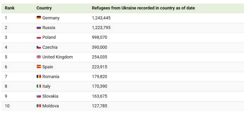 Германија (1,24 милиони), Русија (1,22 милиони) и Полска (998.000) примиле најголем број украински бегалци. Помалите земји како Чешка (390.000), Словачка (164.000) и Молдавија (128.000), исто така, дале значителна поддршка, покажувајќи го широкото влијание на бегалската криза во Украина низ Европа.