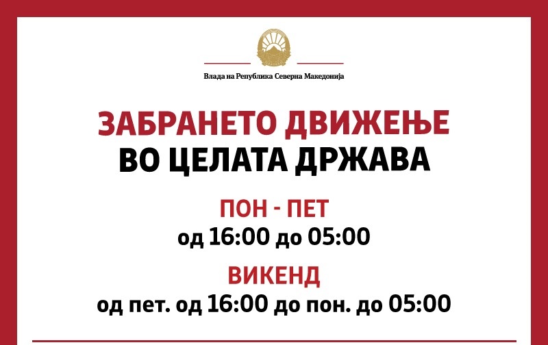 - Дополнително, за лицата над 67-годишна возраст се забранува движењето во текот на сите работни денови, од понеделник до петок, освен во периодот од 10:00 до 12:00 часот. За младите лица до 18 години се забранува движењето во текот на сите работни денови, од понеделник до петок, освен во периодот од 13:00 до 15:00 часот - се наведува во соопштението.
