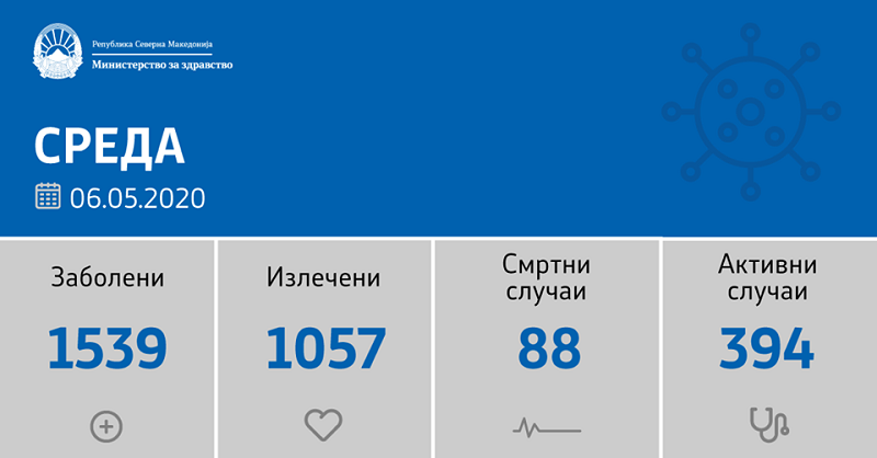 Вкупната бројка на дијагностицирани во нашата земја од почетокот на епидемијата изнесува 1.539 – 1.057 оздравени пациенти, 88 починати, а во моментов бројот на активни случаи во земјата изнесува 394.