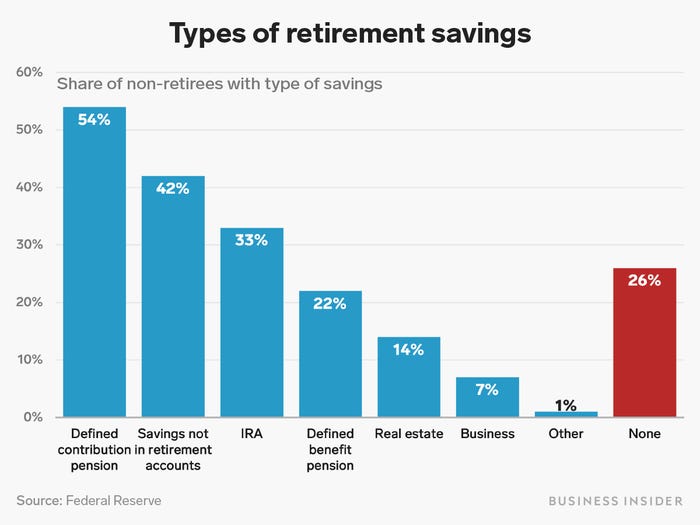 Во рамките на истражувањето од испитаниците било побарано да кажат какви видови заштеди за пензија имаат. Така, 26 отсто од непензионираните возрасни Американци, без оглед на возраста, одговориле дека немаат заштеди за пензионерските денови.