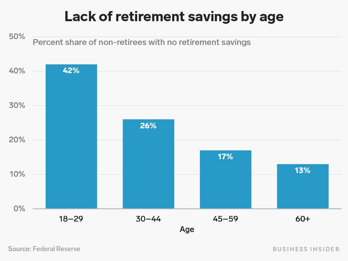Нешто што не е изненадување е тоа што помладите Американци е поверојатно да немаат заштеди за пензионерските денови за разлика од повозрасните. Имено, 42 отсто од непензионираните возрасни лица помлади од 30 години истакнале дека немаат заштеди за пензионерските денови. Сепак, има и голем дел од повозрасните луѓе, кои се поблиску до пензија, а исто така немале заштеди. Поточно, 13 отсто од непензионираните испитаници постари од 60 години рекле дека немаат заштеди за пензионерските денови.