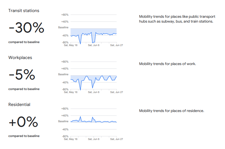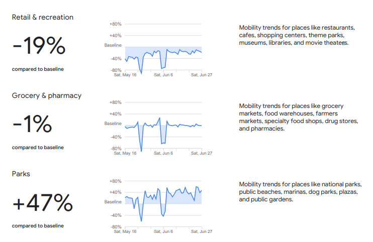 Според последните податоци за Македонија што ги објави „Гугл“ (од 27 јуни), во споредба со основната вредност, движењето на пазари, аптеки и слични места е намалено за само еден отсто, додека во парковите е зголемено за 47 отсто во однос на основната вредност.