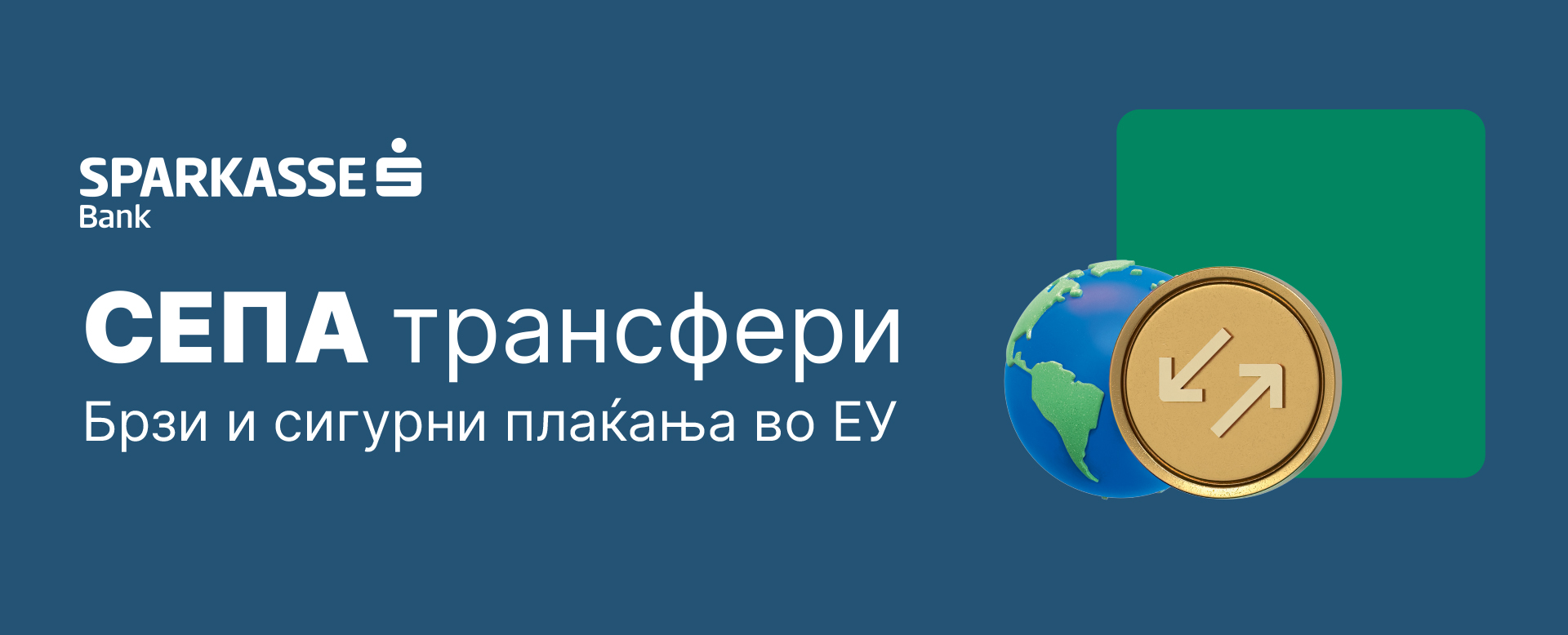 Од денеска, 6 октомври, Шпаркасе Банка АД Скопје започнува со извршување СЕПА-трансфери. Банката направи значаен исчекор кон современите европски платни системи, приклучувајќи се кон Единственото подрачје за плаќања во евра СЕПА (Single Euro Payments Area). Со оваа иницијатива, Шпаркасе Банка станува активен учесник во извршувањето на СЕПА кредитните трансфери, овозможувајќи им на клиентите, физички и правни лица, да вршат и да примаат плаќања во евра под исти услови и права како во другите земји членки на СЕПА.