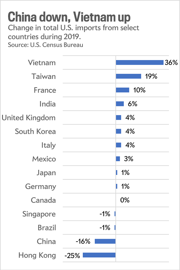 Најголемиот победник е Виетнам со оглед на тоа што многу американски компании се одлучиле за алтернативи од оваа земја во повеќе индустрии. Увозот од оваа земја во САД се зголемил за 36%, односно за 17,5 милијарди долари.
