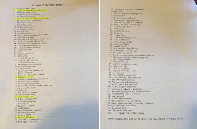 На еден од првите часови во учебната година, на еден од часовите по психологија, учениците добиле листа со 101 начин за справување со стресот.
