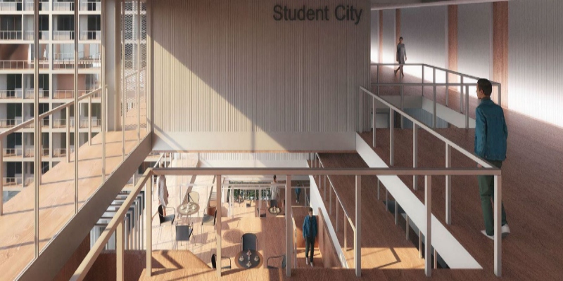 До просториите се проектирани широки ходници со отвори во панелите, кои се лизгаат хоризонтално и на овој начин визуелно и просторно ги поврзуваат сите катови. Дел од коридорот на секој кат е составен од заеднички простори за студентите. Предвидено е на покривите да се постават соларни панели, кои ќе произведуваат електрична енергија исклучиво за сопствените потреби на објектот, како и сончеви колектори за добивање топлинска енергија.