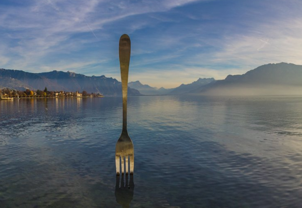 Да, добро прочитавте: огромна виљушка излегува од Женевското Езеро во овој дел од брегот. Необичниот споменик наречен „Ла Фурчете“ е поставен во 1995 година во чест на 10-годишнината од Алиментариумт, градскиот музеј посветен на исхраната. Споменикот бил направен од швајцарскиот уметник Жан-Пјер Кауг.