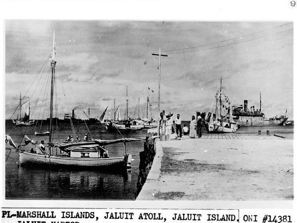 Трагата е во ознаката на фотографијата која гласи: „Маршалски Острови, атол Јаулит, остров Јаулит, пристаниште Јаулит“.