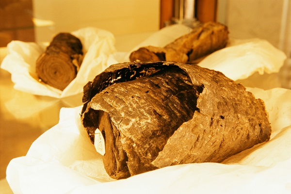 Два цели свитока и четири фрагменти - т.н. свитоци од Херкуланеум - биле јагленисани во смртоносната ерупција на Везув во 79 година и се премногу кревки за да се отвораат.
