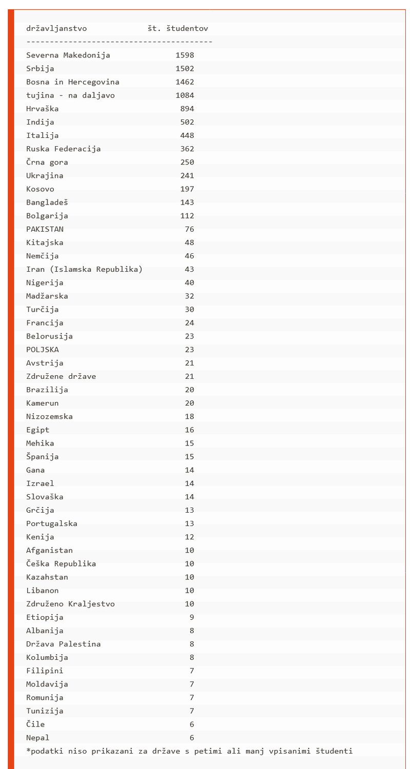 Ако пред шест години странските студенти сочинуваа 4,5 отсто од студентската популација, денес овој удел е повеќе од тројно зголемен и изнесува речиси 14 отсто. Во последната академска година на универзитетите во Словенија студирале 70.914 студенти, од кои 9.681 биле странци.