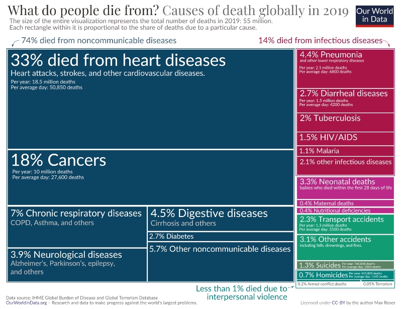 Вооружениот конфликт е многу поретка причина за смрт отколку незаразните (сини полиња) или заразните болести (црвени полиња). Исто така, поретка е од другите причини за насилна смрт: над пет пати повеќе луѓе умреле од убиства во 2019 година и речиси десет пати повеќе од самоубиства.