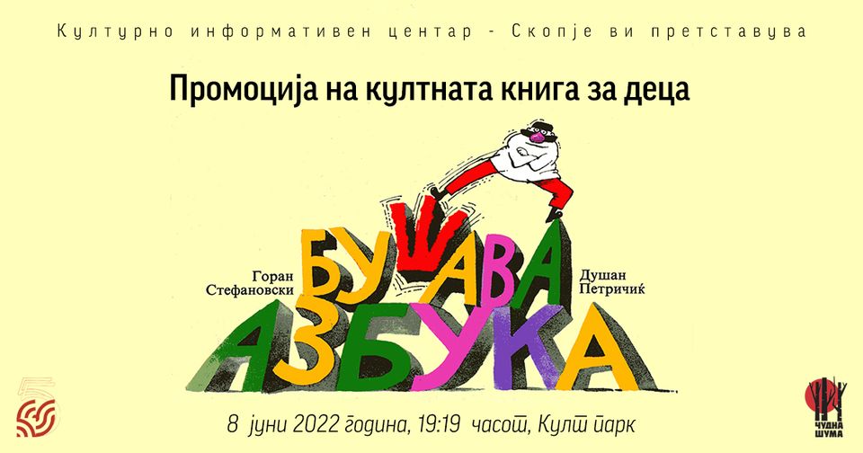 Во издание на издавачката куќа „Чудна Шума“ денеска во 19:19 часот, во Културно-информативниот центар – Скопје ќе биде промовирана култната книга за деца „Бушава азбука“ од Горан Стефановски и Душан Петричиќ.