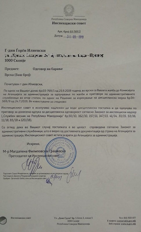 „Инспекцискиот совет е исклучиво надлежен да води дисциплинска постапка и да одлучува по приговор за донесена одлука за дисциплинска одговорност согласно Законот за инспекциски надзор. Со оглед дека во Вашиот случај постапката е во целост спроведена согласно Законот за административни службеници, што е видно од доставената документација од страна на Агенцијата за администрација, Инспекцискиот совет истата ја врати до Агенцијата за администрација“, пишува во дописот од Инспекцискиот совет.