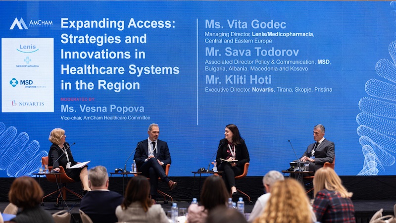 Последниот панел на конференцијата, насловен „Проширување на пристапот: стратегии и иновации во здравствените системи во регионот“, беше отворен од страна на Весна Попова, заменик претседател на комитетот за здравство на АмЧам. Нејзини соговорници беа: Вита Годец, извршен директор на Lenis/Medicopharmacia за Централна и Источна Европа; Сава Тодоров, директор за јавни политики и комуникации на MSD за Бугарија, Албанија, Северна Македонија и Косово; и Клити Хоти, извршен директор на Novartis за Тирана, Скопје и Приштина.