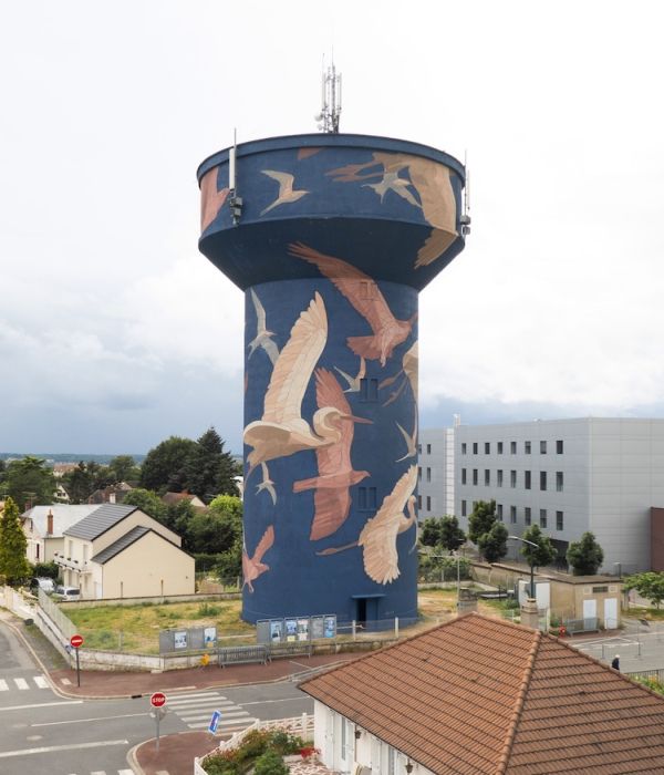 Сместен покрај реката Лоара во Франција, градот Гиен има нова знаменитост благодарение на вештините на уличниот уметник Такен. Шпанскиот уметник помина речиси две недели трансформирајќи еден од трите резервоари за вода во градот во уметничко дело. Резултатот е прекрасен споменик кој ја користи нежната палета на бои.