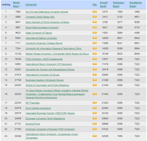 Универзитетот на Југоисточна Европа се најде на 4.567. место на ранг-листата. На 4.633. место се најде Државниот универзитет во Тетово, а најлошо рангиран универзитет во Македонија е „Визион“, кој се најде на 32.029. место.