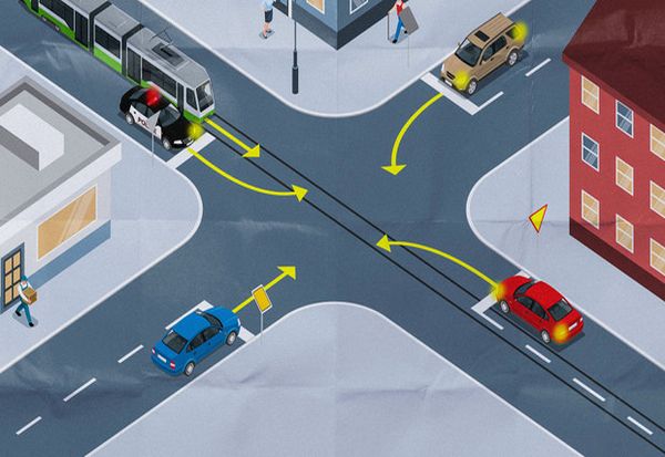 Следен е трамвајот, бидејќи го одржува правецот на движење, но и поради фактот што станува збор за возило на шини. Црвениот автомобил последен ја минува раскрсницата.