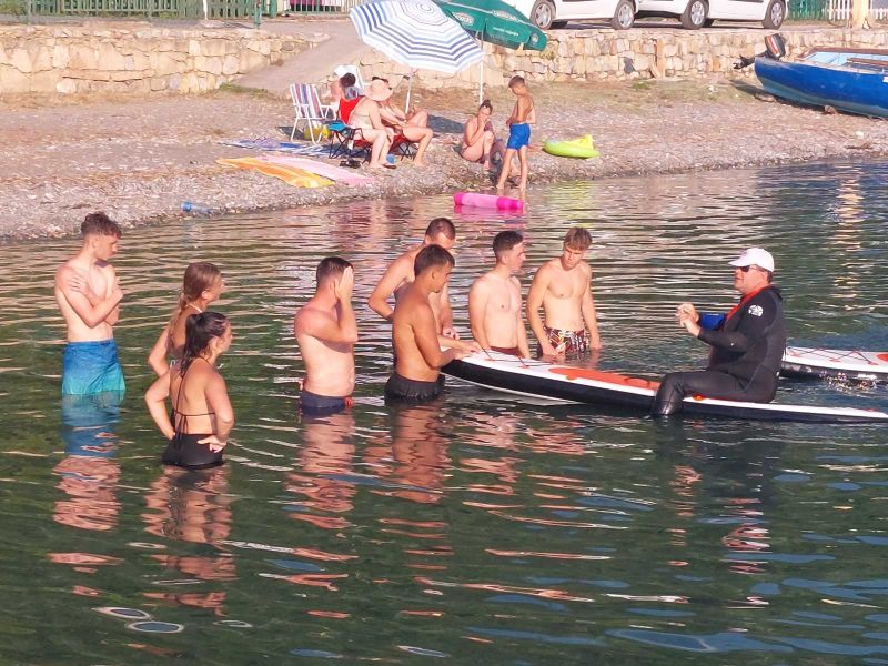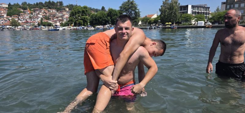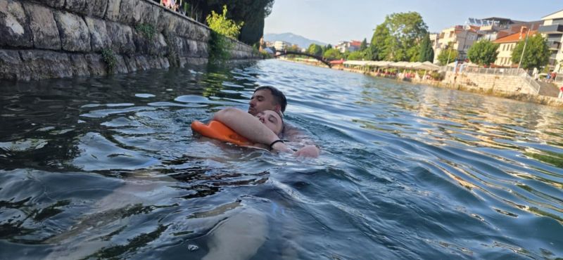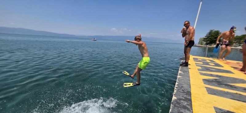 - Имаме и вадење капач од езерско дно, што е една од најтешките вежби. Спасителот треба да нурне на минимум два метра и да го извлече манекенот кој тежи 60-70 килограми и да го изнесе на плажа до спасителниот пункт. Ова е езерска површина која е оддалечена 100 до 200 метри од пунктот и затоа се работи за тешка вежба. Затоа кандидатот мора да биде комплетно психофизички подготвен. Ова не е курс за пливање, вие треба да бидете спремни дека тука има 7 дена активност: пливање, скокови во вода, возење на чамец, супови, работа на река.... На курсот не ги милуваме кандидатите, тие од почеток се предупредени дека станува збор за тешка обука, за 7 интензивни работни дена. Имате утринско предавање, па одење на езеро, мала пауза за ручек, повторно има теоретски дел, па потоа повторно плажа до 19 часот - образложи националниот инструктор.