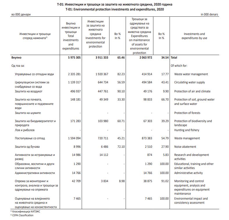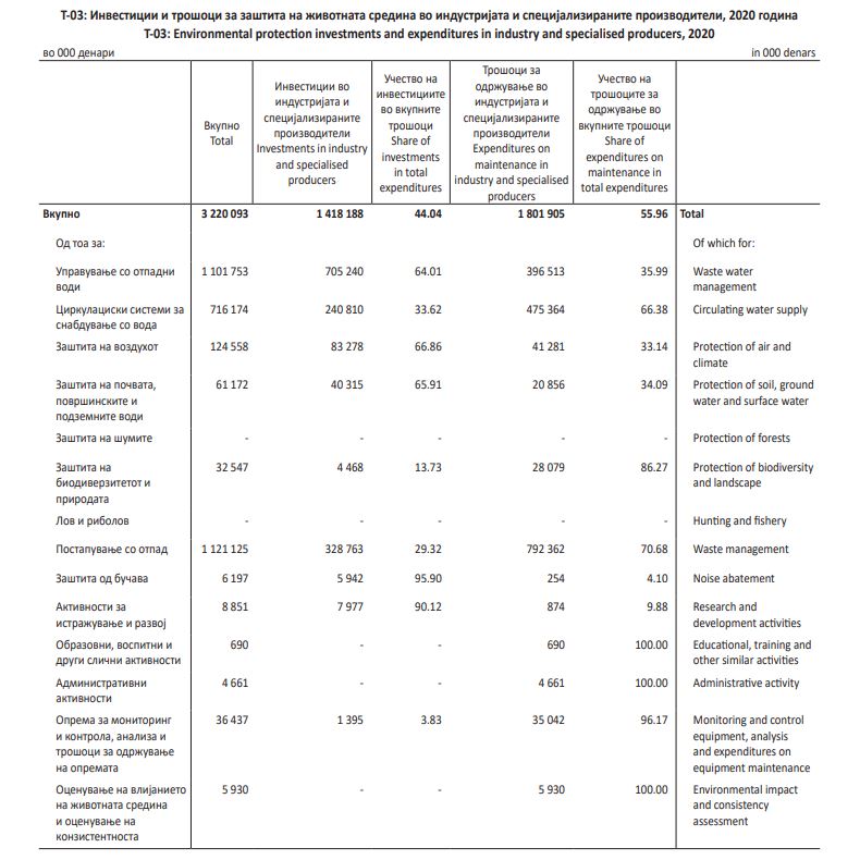 Од направените трошоци за заштита на животната средина во индустријата и специјализираните производители, 44,04% се наменети за инвестиции, а 55,96% се за одржување на средствата.