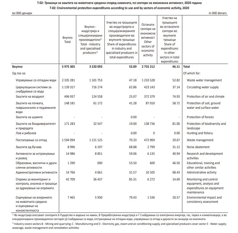 Од вкупните трошоци за заштита на животната средина, најмногу трошоци се направени во индустријата и специјализираните производители, 3.220.093 илјади денари, односно 53,89%.