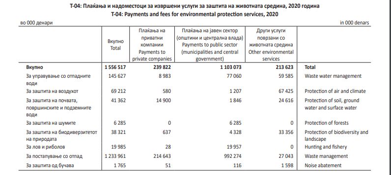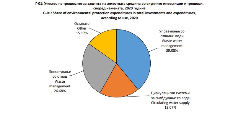 Во вкупните трошоци за заштита на животната средина според еколошката намена, најголемо е учеството на трошоците за управување со отпадни води (39,08%), потоа учеството на трошоците за постапување со отпад (26,68%) и на трошоците за циркулациски системи за снабдување со вода (19,07%).