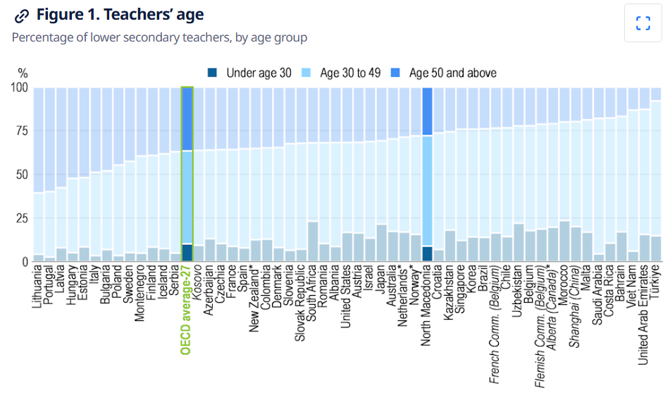 Во најновото издание на анкетата TALIS 2024 учествуваше и нашата земја, чија анализа открива интересни согледувања за наставната професија во земјата и даде јасна слика за наставниот кадар во земјата. Имено, анкетата покажа дека поголемиот дел од наставниците се жени (74 отсто), а просечната возраст изнесува околу 44 години, што ја става земјата блиску до просекот на земјите членки на ОЕЦД.