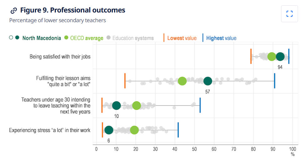 И покрај економските и организациските предизвици, вкупното задоволство од професијата останува високо. Повеќето, односно 94 отсто од наставниците изјавиле дека се горди на својата работа и сметаат дека професијата е вредна и значајна за општеството. Особено охрабрувачки е фактот дека само еден од десет млади наставници планира да ја напушти професијата во наредните пет години, што е двојно помалку од просекот во земјите на ОЕЦД.