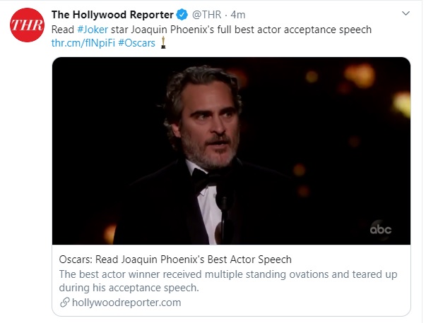 Хоакин Феникс одржа инспиративен и емотивен говор, велејќи дека со поддршката на сите во салата тој станал тоа што е. Тој се осврна и на фактот дека луѓето мора да станат помалку себични.