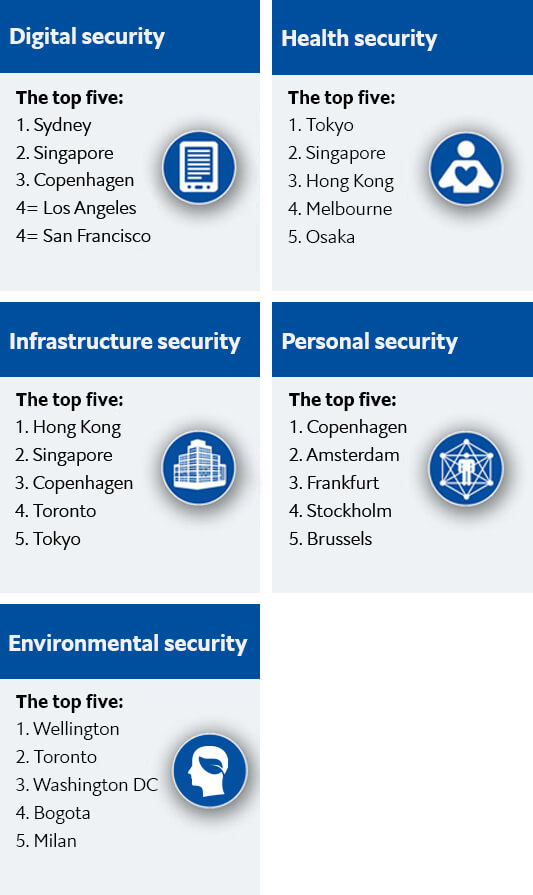 Копенхаген ги следеше Сиднеј и Сингапур, кои се најдоа на високи места според безбедноста на урбаната инфраструктура, која беше мерена според квалитетот на изградената средина и нејзината отпорност на природни катастрофи.