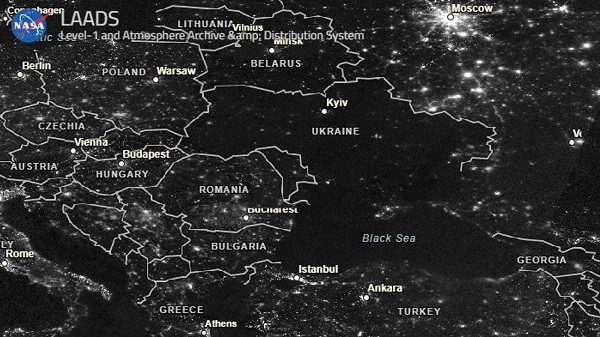 Речиси цела Украина е во мрак, покажуваат сателитски фотографии од Европа направени ноќе. Се забележува големата разлика помеѓу соседните земји и Украина, која веќе две седмици е во војна со Русија.