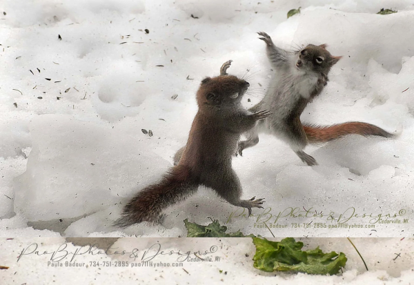 Она што Бадур го забележала тоа утро биле две црвени верверички кои се карале околу зелена салата што се наоѓала во близина. Верверичките скокале една кон друга и се бореле, а Бадур успеала да сними фотографии од нивната кратка пресметка.