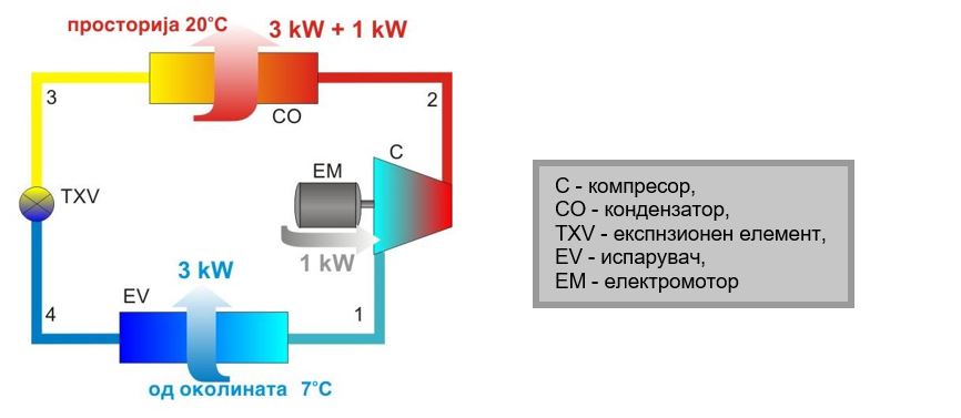 Дефиниција за топлинска пумпа: тоа е уред кој одзема топлина од околината (воздух, вода, земја) и ја предава на средина со повисоко температурно ниво за греење (најчесто на простории). На сликата се гледа дека се одзема 3 kWh топлина од околината, се троши 1 kWh ел. енергија во електромоторот и се добива 4 kWh топлина за греење на просторијата. Значи, за 1 kWh потрошена ел. енергија се добива 4 kWh топлина. За споредба: кај електрична печка или греалка за да се добие топлинска енергија од 4 kWh, треба да се потроши 4 kWh ел. енергија, значи четири пати повеќе. Грејниот фактор во овој случај е еднаков на 4, но тој може да биде и поголем, особено ако се зема просечната вредност во текот на целата грејна сезона. Овој фактор зависи и од енергетската класа на топлинската пумпа, при што класата “А“ е најдобра. Пожелно е топлинските пумпи да имаат инвертер со кој се овозможува континуирана промена на бројот на вртежи на моторот, а со тоа и квалитетна регулација и висока енергетска ефикасност.