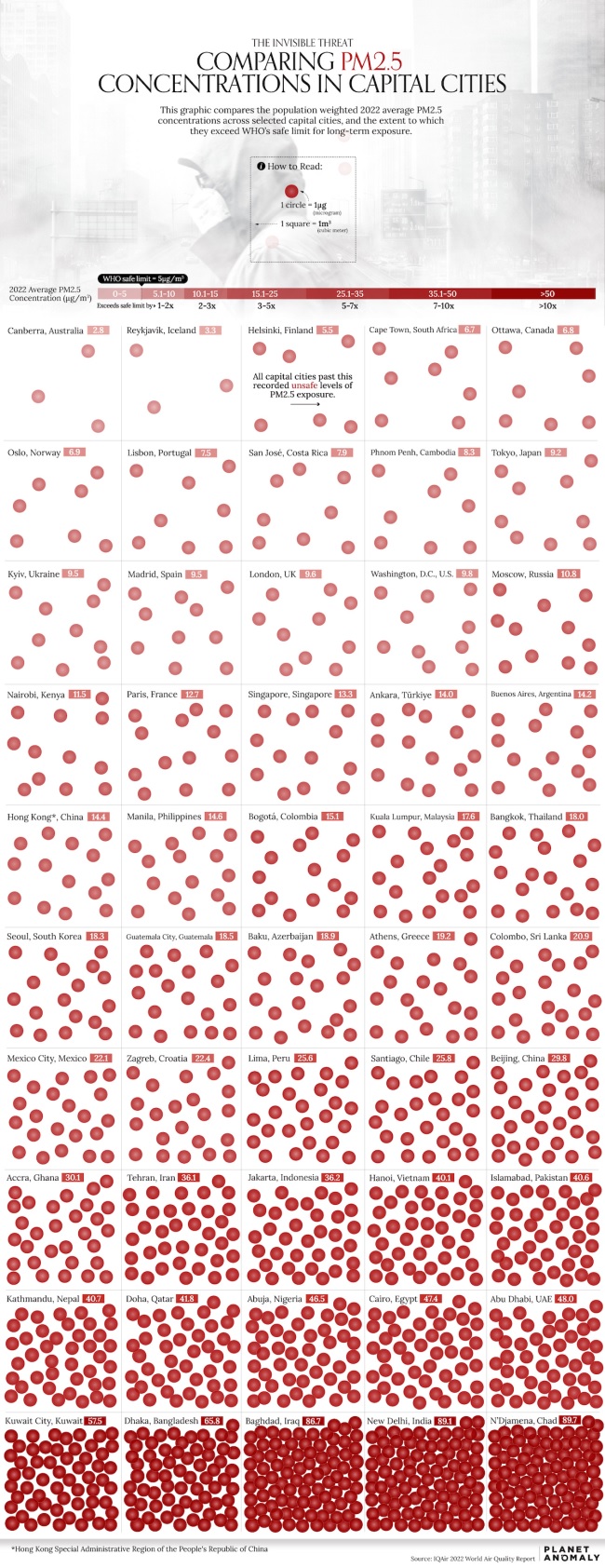 Визуализација на „Планет аномали“ покажува како стојат главните градови на светот во поглед на загаденоста на воздухот. Најчист воздух има Канбера со 2,8 микрограми ПМ2,5 честички на кубен метар, а најзагаден Нџамена, Чад со 89,7 микрограми ПМ2,5 честички на кубен метар.
