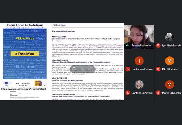 Професорката Рената Петревска-Нечкоска од Економскиот факултет – Прилеп низ колаж од материјали во презентацијата се осврна кон два главни моменти: Академијата како дистинктивна сила и придонесот кој може да го имаат професорите, научниците, истражувачите во адресирање на светските проблеми и нивно решавање. Таа го посочи и искуството од EUvsVirus како проектен менаџер за институциите од академија и истражување & развој во насока на градење мостови на соработка чекор по чекор: Тандеми на магистранди од УКЛО & УГент Белгија, трасиран пат за заеднички осврт на магистерски предизвици од различни аспекти на студенти од двата, институциите на двете држави, и домените на примена на научните сознанија.