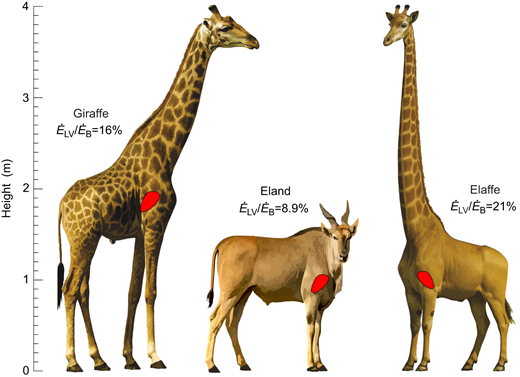 Истражувачите ја квантифицирале енергетската цена на испумпувањето крв за една просечна возрасна жирафа и ја споредиле со замислено животно со кратки нозе, но подолг врат за да може да ја достигне истата висина до врвовите на дрвјата. Истражувачите го нарекле ова замислено животно елафа. Утврдиле дека тоа би трошело 21 процент од вкупната енергија само за срцето, во споредба со 16 % кои ги троши жирафата и 6,4 % што ги троши човекот.